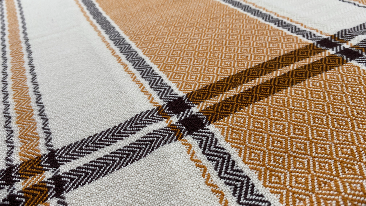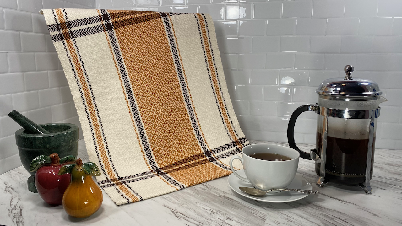 This kitchen towel includes stripes reminiscent of vintage tea towels with a diamond pattern featured in the center of the towel.