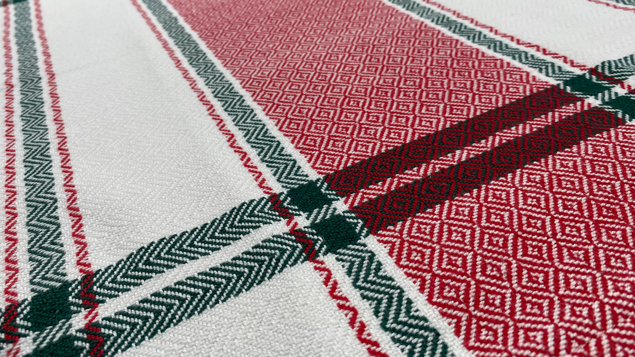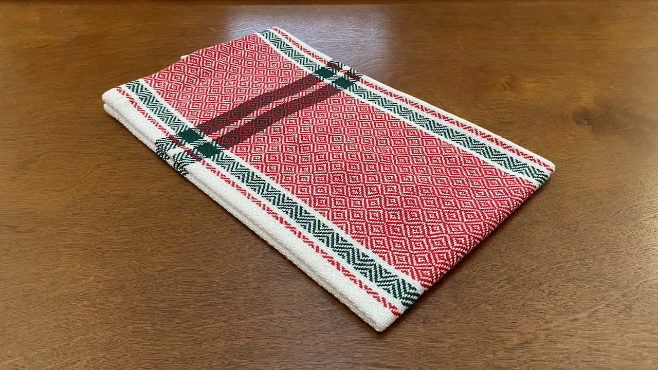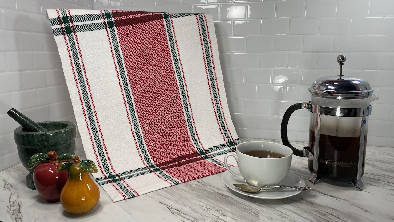 This kitchen towel includes stripes reminiscent of vintage tea towels with a diamond pattern featured in the center of the towel.
