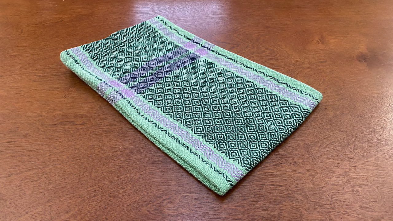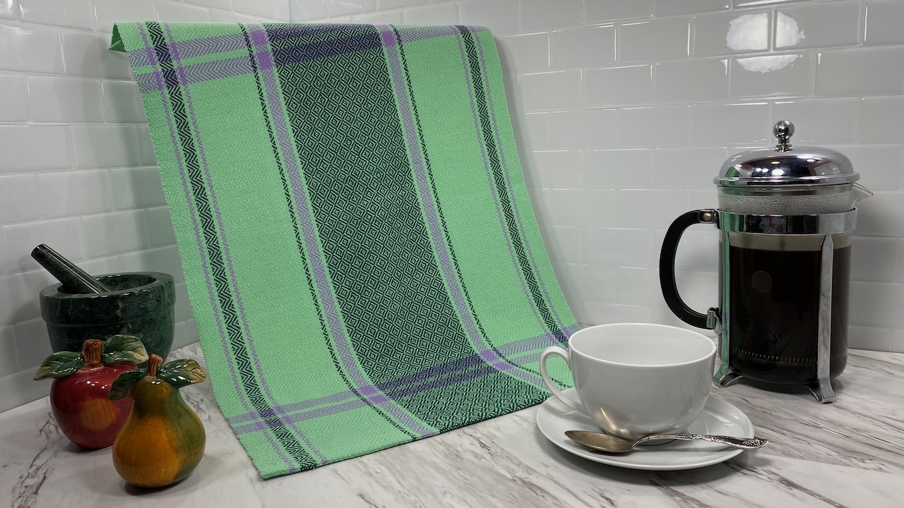 This kitchen towel includes stripes reminiscent of vintage tea towels with a diamond pattern featured in the center of the towel.